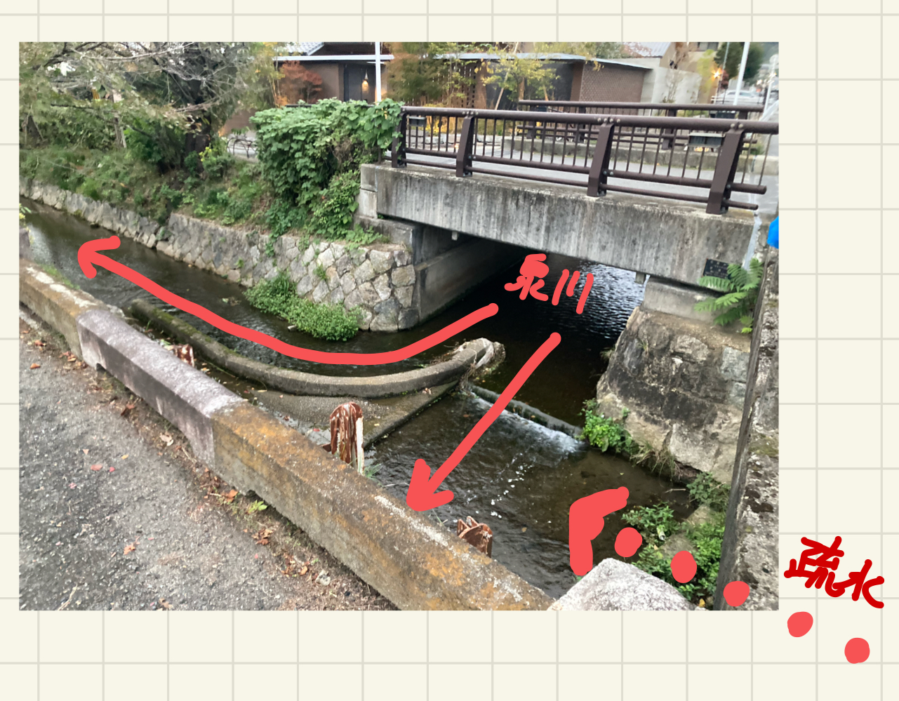高野川交差以上にスキャンダラスなのが泉川交差だ。 現地でこれを見た時は驚いた(図6)。 途切れてしまった流れを埋め合わせるかのように、泉川の一部を疏水分線に引き込んでいる。 泉川は高野川の支流である。 琵琶湖以外の水が公然と積極的に取り入れられるのを見ると、なんだか裏切られたような気持ちになってしまうが、水路を清潔に保つためには致し方ない[9]ようだ。