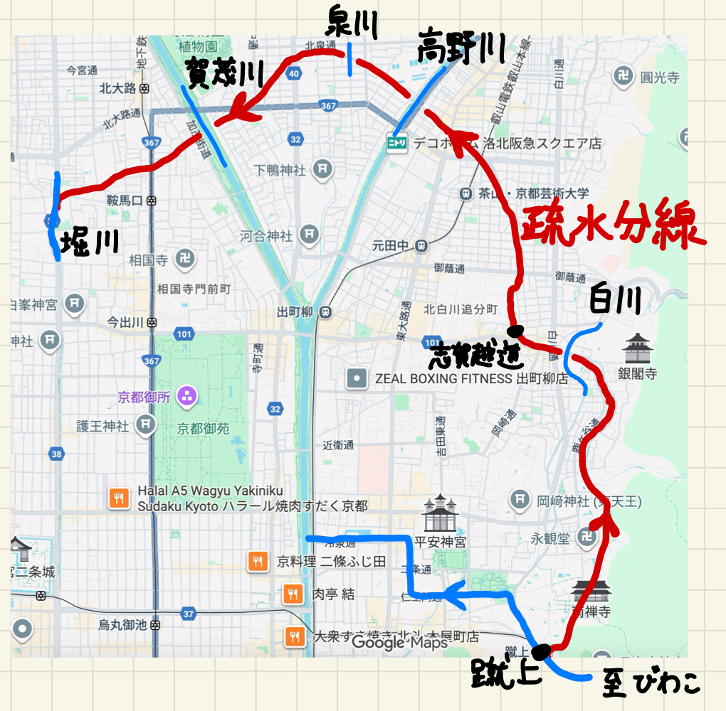 人口密集地である京都に豊かな琵琶湖の水を引くという野望は昔から存在したが、二つを隔てる大坂の関などの山によって阻まれていた。 (というより、山で京都・大阪と隔絶しているので水が溜まって琵琶湖ができたという方が正しいかもしれない。) 明治の中頃、遷都によって衰退した京都を活気づけるという目的と西洋の土木技術という手段が重なり、トンネルを掘って琵琶湖から運河を引く公共事業が実現した。 こうしてできたのが琵琶湖疏水だ。 以来130年間、上水道・灌漑・水運・発電などさまざまに利用されてきて、2025年には一部が国宝に指定された。 今回の記事では特に疏水分線を取り上げる(図1)。 京都側でトンネルから出てきた後、京都盆地を北に迂回して堀川と合流する流路に沿って、疏水分線の興味深いポイントを見ていこう。