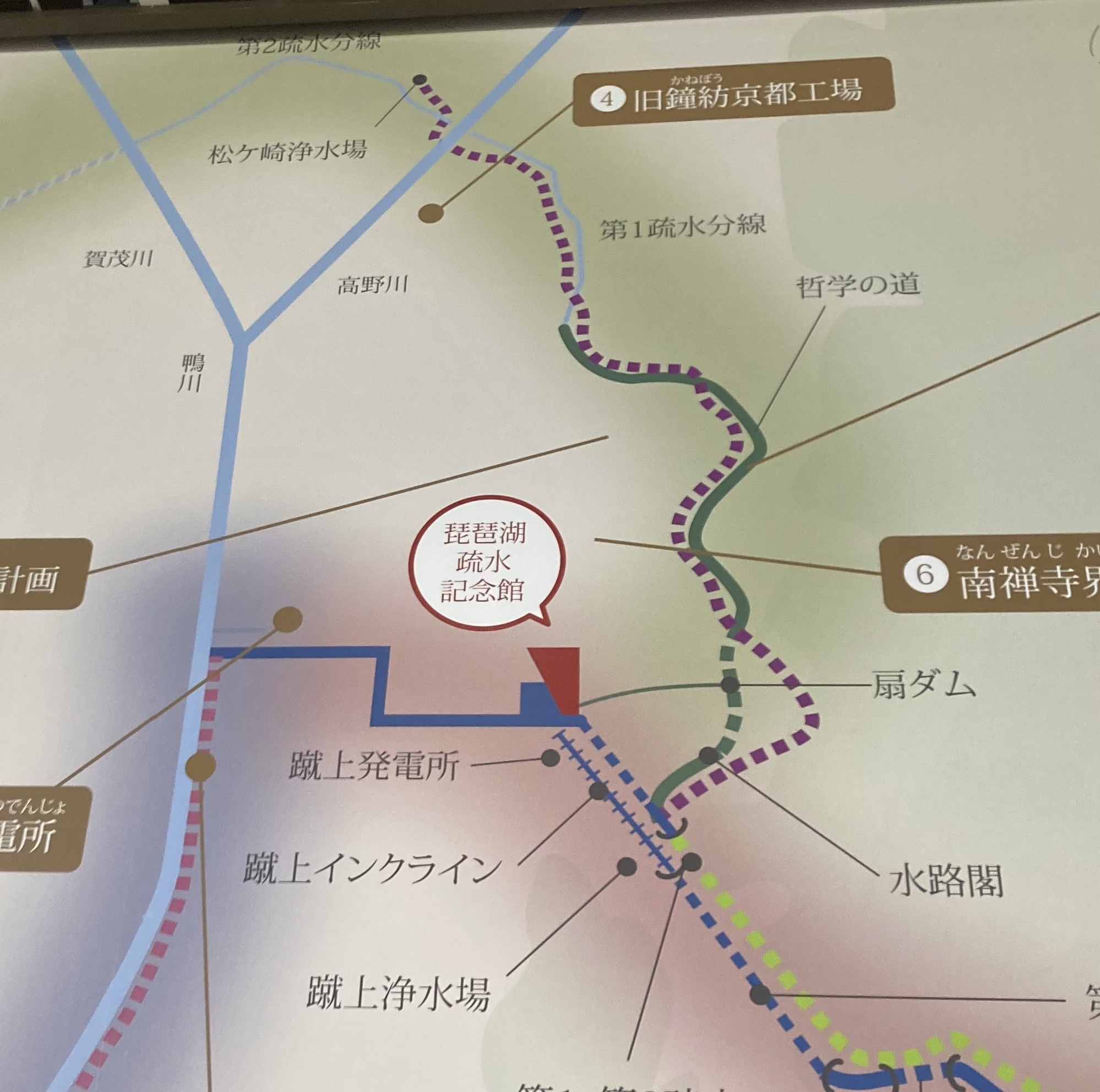余談だが、京都は北が高くて南が低いので疏水分線は高低差に逆らっているように見える。しかし実際は蹴上の標高を失わないようにほぼ等高線に沿って流すことで北まで運んでいるそうだ。 当時の測量が偲ばれるところだ。